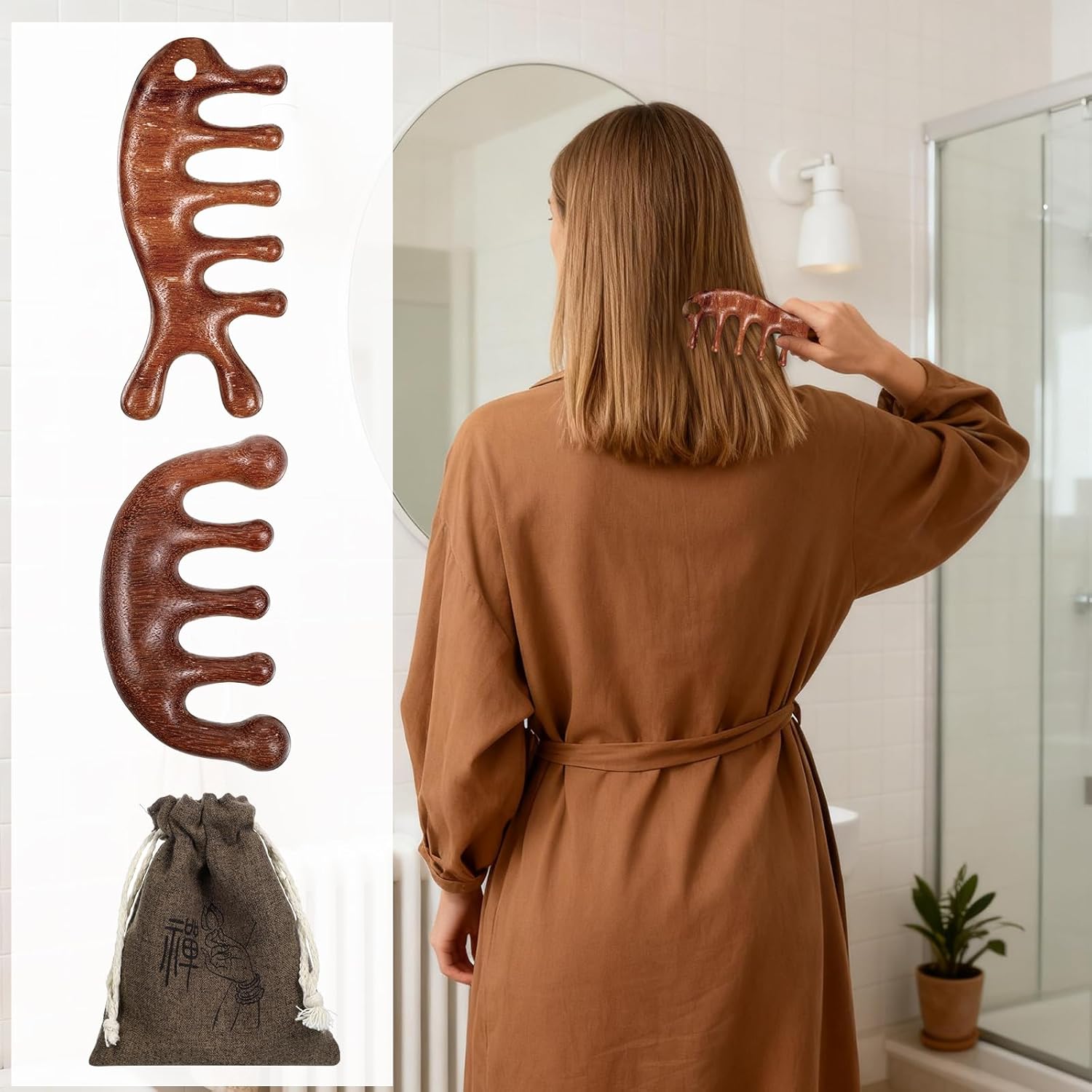 Dual Massage Design: 2 woodenmassage combs offer support: one forscalp gua sha and facial relaxation, another for head/neck massage. Reduces fatigue and improves sleep quality effectively