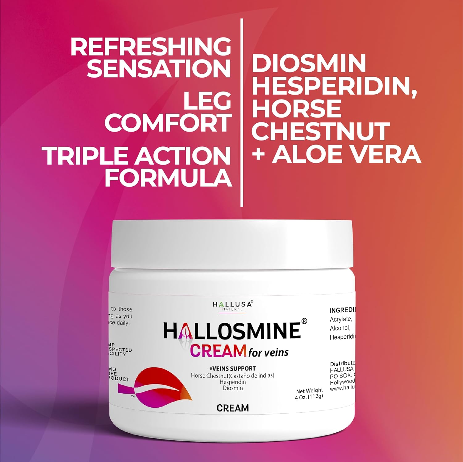 Hallusa Natural Hallosmine Cream for Veins Support and Leg Comfort | Triple Action Formula: diosmin, Hesperidin and Horse Chestnut | with Aloe Vera and Menthol for a Cooling Effect | 4 oz
